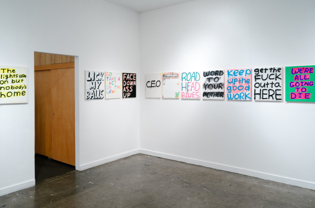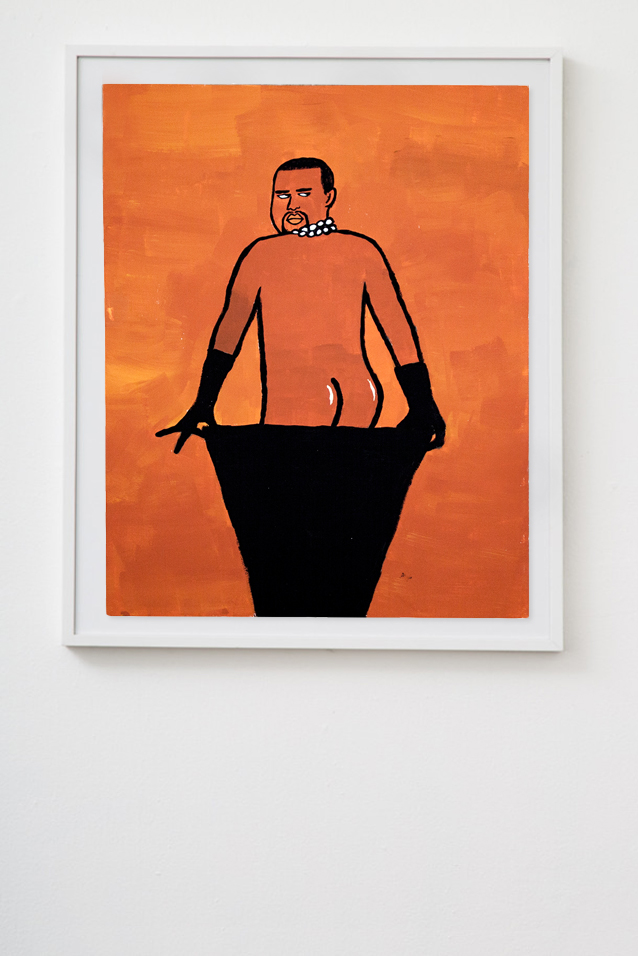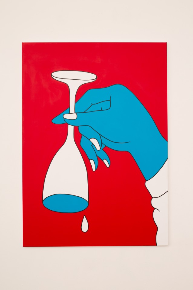 The works in Same Old Song are overturned wine glasses, leisure-suited perverts, and behind-the-bar-booty slaps arranged in compositions of red, white, blue, pink, Ben-Day dots, and stars. In all its orgiastic fervor, his work is foremost graphic in character: tightly controlled compositions, highly saturated colors, flood-filled silhouettes, flatness, and hard edges that are hallmarks of the comic tradition that Lichtenstein had notoriously usurped to conflate the proverbial high-and-low strata of the 1960s Pop movement.